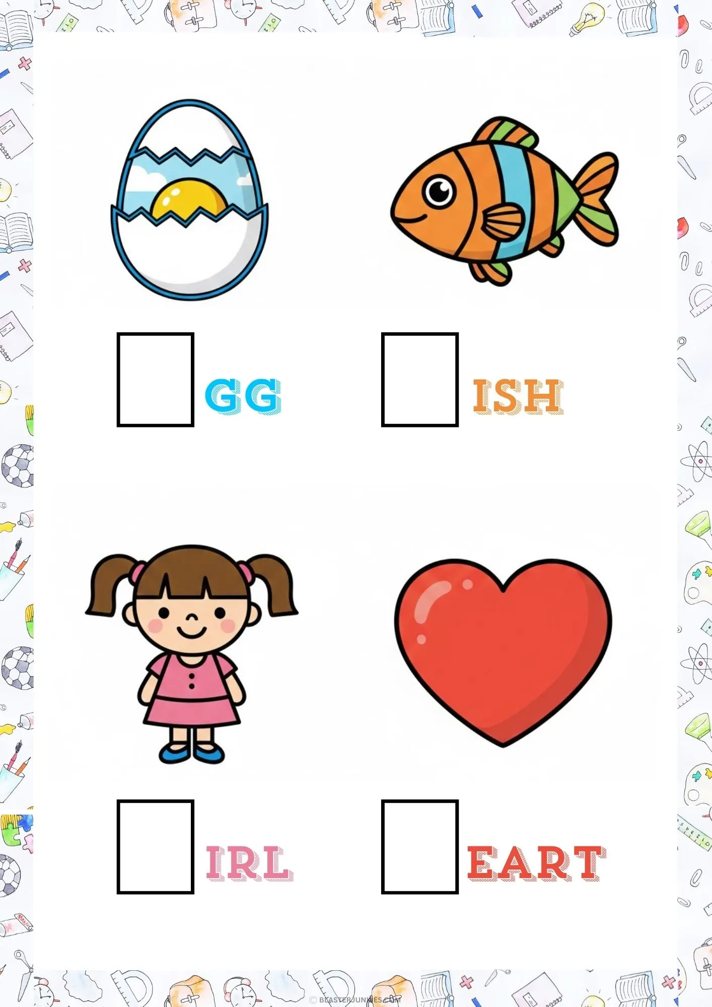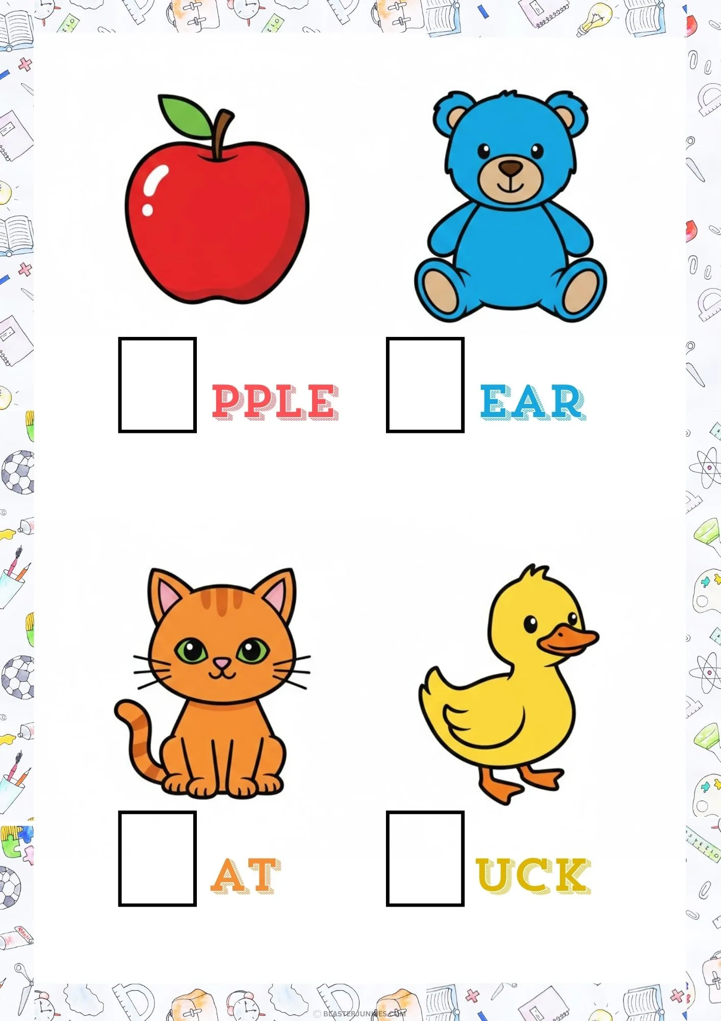 A Blank Box: A space designated for the child to provide the missing initial letter.