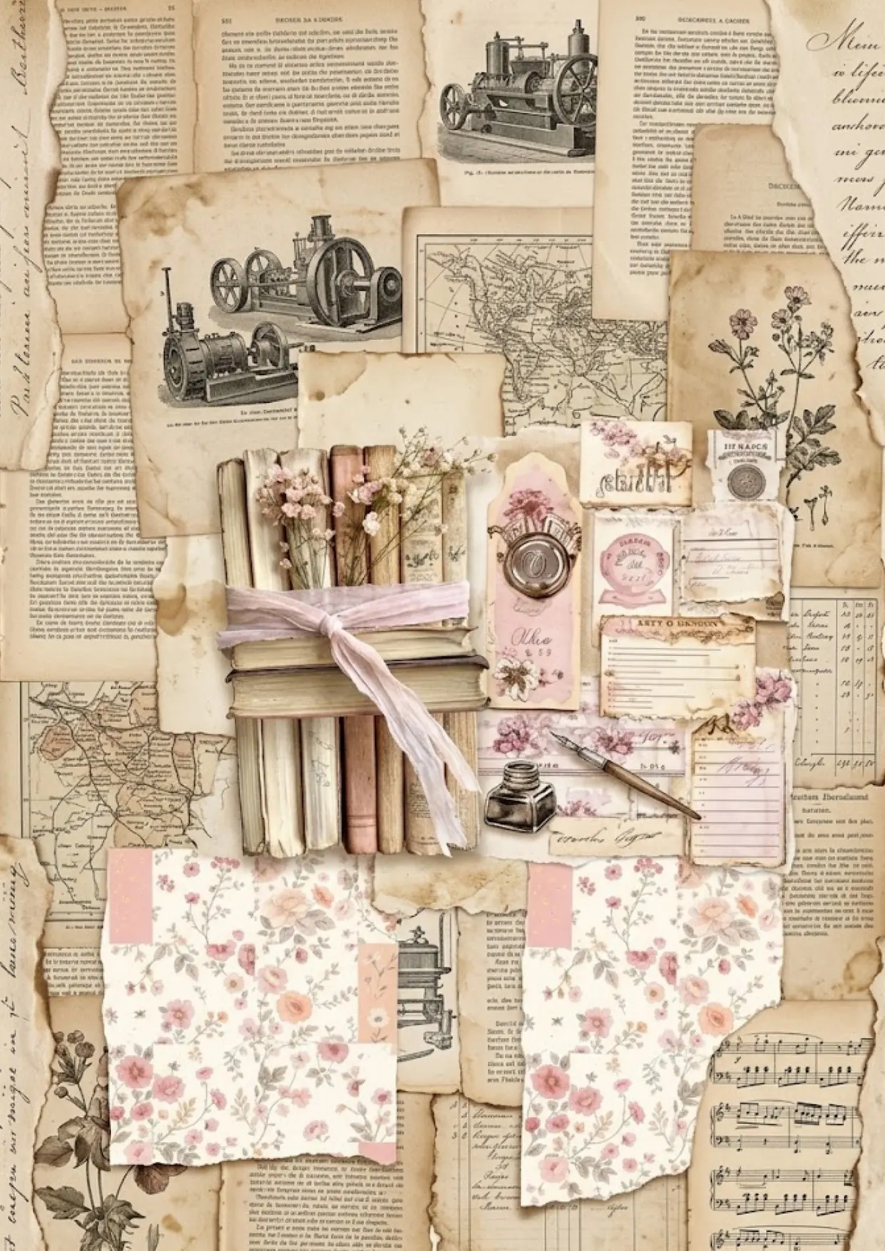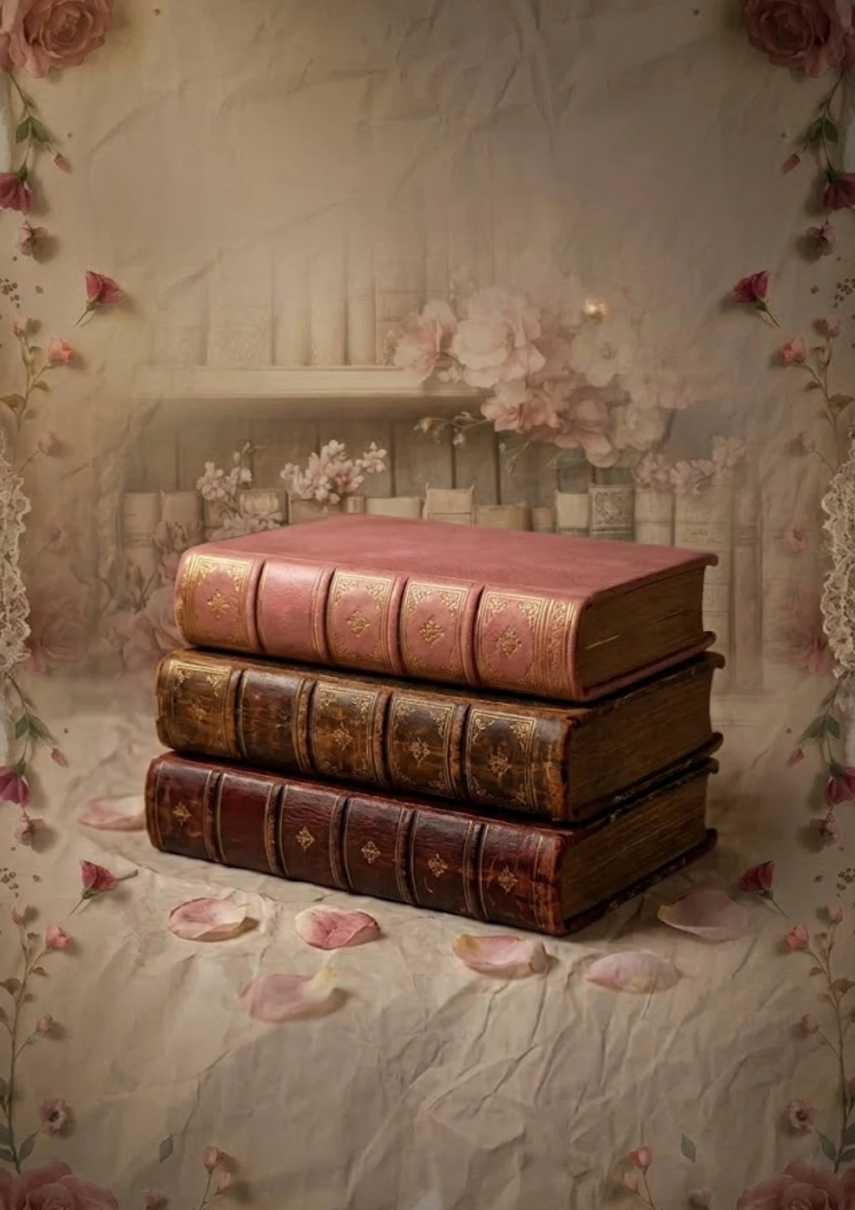 Atmospheric Background Pages (Pages 3, 4, 8, 10, 12, 37, 38): These pages serve as the “canvas.” They feature high resolution textures of crushed parchment, water stained tea paper, and soft focus imagery of bookstacks draped in lace and pink peonies.