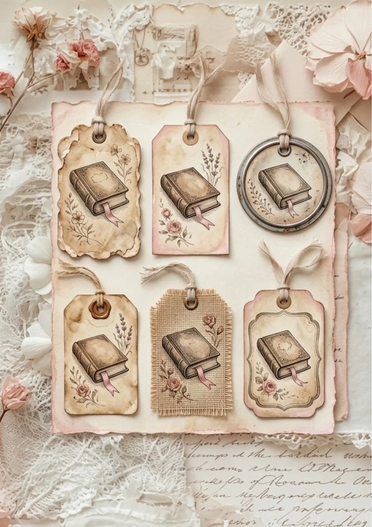 Ephemera & “Fussy Cut” Elements (Pages 13, 15, 34, 35): These pages are meant for cutting. They feature vintage bookmarks (Page 13), book themed tags with twine holes (Page 15), and a wax seal with a book emblem (Page 35).