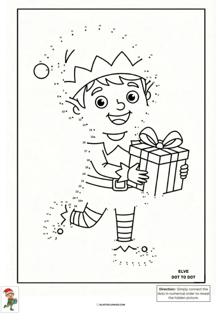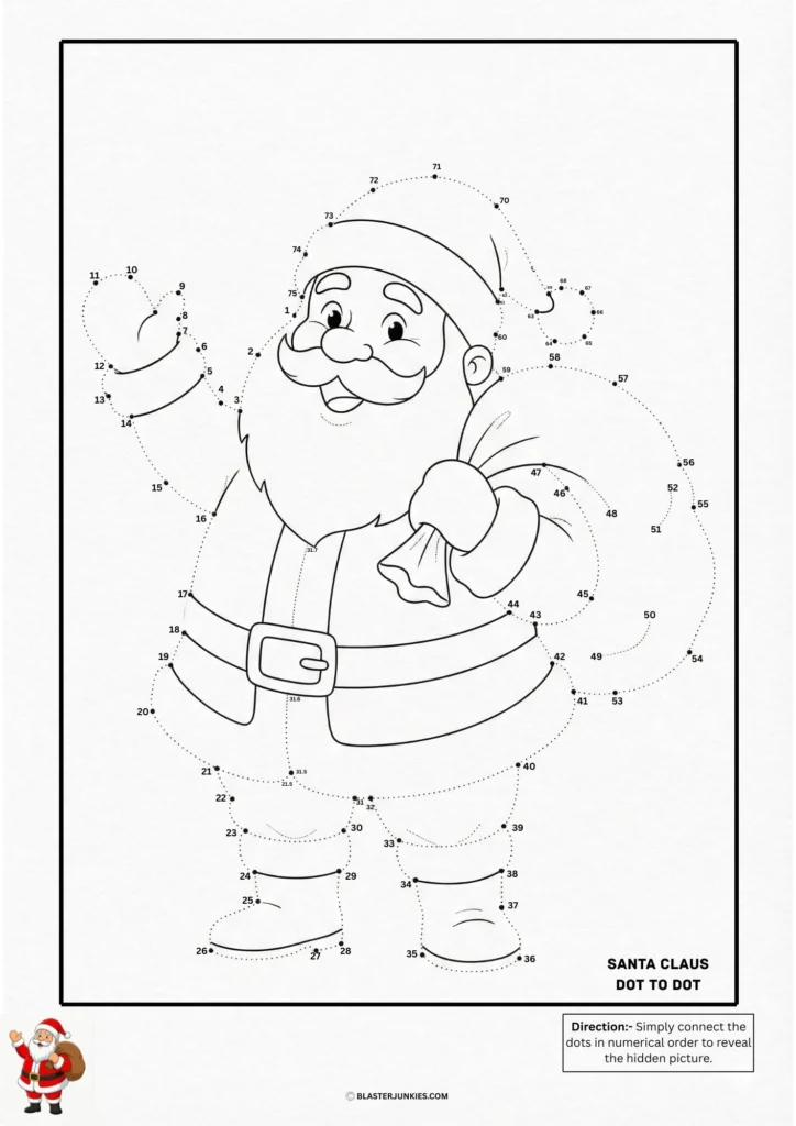 The main event! This puzzle is a little more detailed (going up to higher numbers), making it perfect for slightly older kids who want a challenge. Connect the dots to reveal Santa waving with his sack of toys.