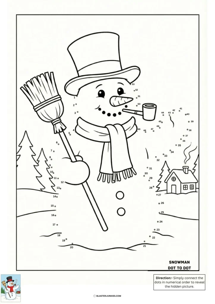 Bring this winter scene to life! This snowman comes complete with a top hat, a pipe, and a broomstick. The numbers guide the pencil to create his round shape, making it a satisfying puzzle to solve.