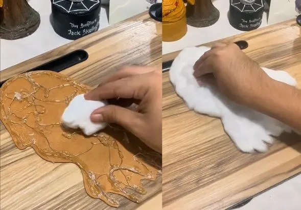 Press it firmly onto the cotton covered cardboard base, lining up the edges. You should now have a complete Ghostface shape with a layer of cotton sandwiched in the middle.