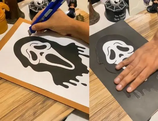 Start by cutting out your printed Ghostface silhouette. Trace its outline onto your piece of cardboard and carefully cut it out using your craft knife.