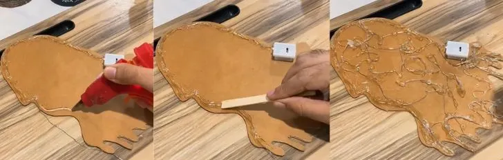 Place this layer over the entire surface of the cardboard, covering all the lights and wires. Use small dabs of hot glue to hold it in place. The cotton will act as a diffuser, softening the light beautifully.