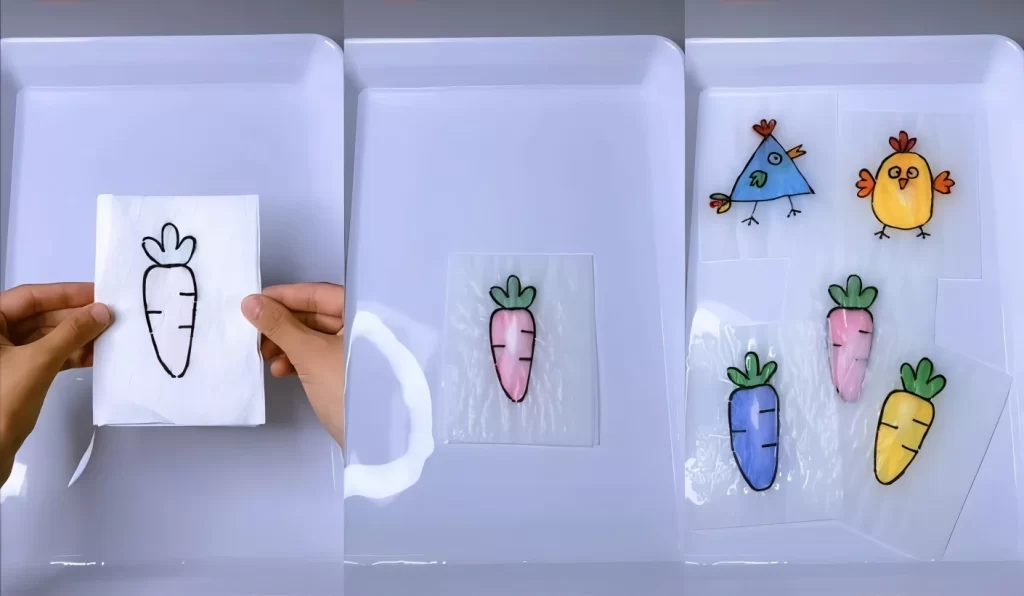 Watch closely! As the water soaks through the paper, the top layer will become transparent, magically revealing the bright colors you hid inside! Your black and white drawing will instantly transform into a colorful masterpiece.