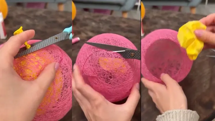 Once your orb is completely dry and hard, it’s time for the most satisfying part. Take your scissors or a pin and pop the balloon inside! The string structure will hold its spherical shape perfectly.