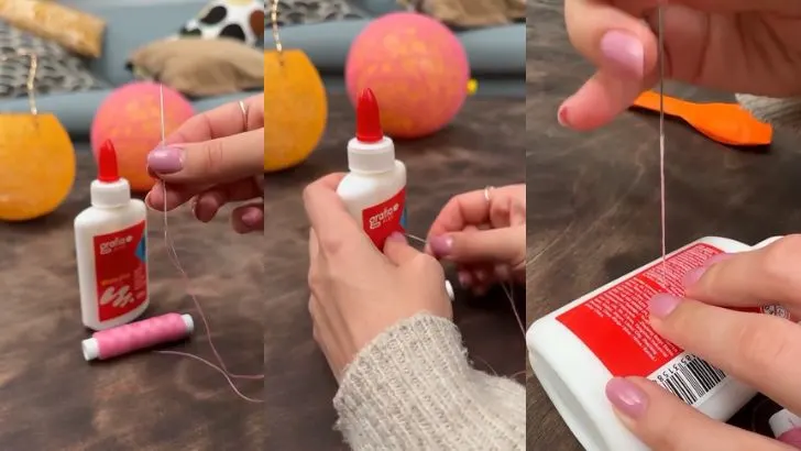 Thread your needle with the end of your string spool. Carefully push the needle straight through your bottle of glue, entering one side and exiting the other.