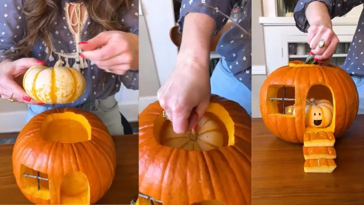 This design is pure autumn charm. By combining a large pumpkin with a mini one, you can create a whimsical little house, complete with a friendly resident peeking out the door.