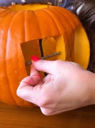 Build the Windowpane: Use small twigs to create a cross shape inside your square window opening, securing them by poking them into the pumpkin flesh.