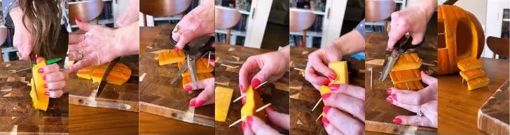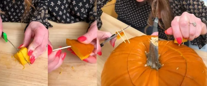 Attach the Ears: Stick a couple of toothpicks into the bottom of each triangle piece. Then, carefully press the triangles into the top of the pumpkin where you want the ears to be. The toothpicks will hold them securely in place. Meow-lloween complete!