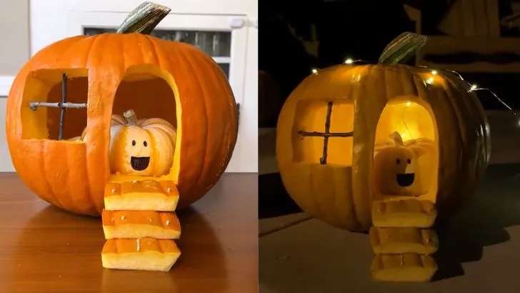 Light It Up: Add a flameless candle inside the house to light up the window, and tuck some fairy lights inside for an extra magical glow. This cozy pumpkin home is now ready to welcome trick-or-treaters!