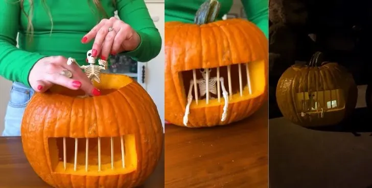 Place Your Prisoner: Now for the fun part! Place your small skeleton inside the pumpkin, positioning it behind the bars. You can have its arms reaching out through the bars for an extra spooky effect. Pop a flameless candle inside, and your pumpkin jail is ready to haunt the neighborhood!