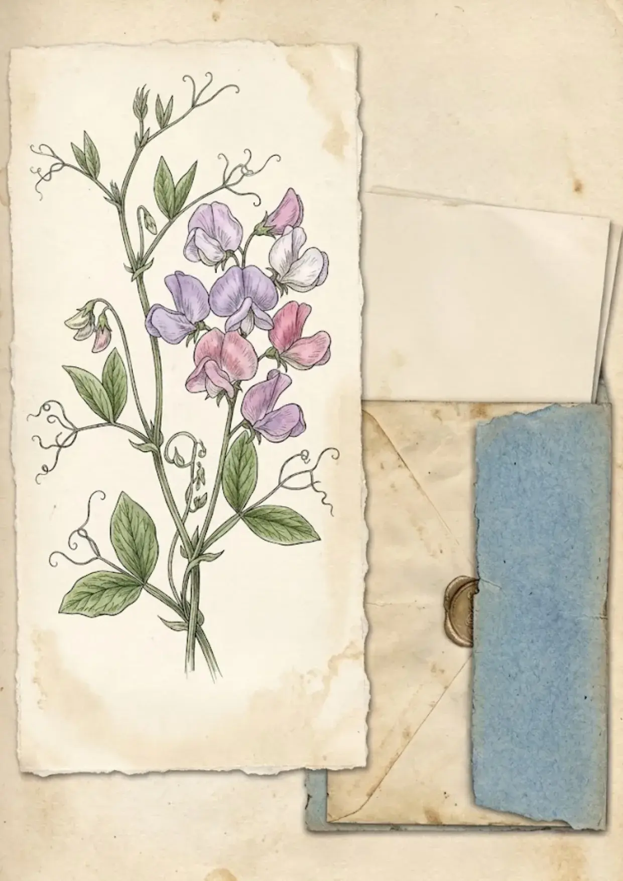 Take Page 12 (The Sweet Pea Envelope). Cut out the blue tinted paper scrap. Glue only the bottom and side edges of the scrap onto the main page. This creates a “tuck spot” where you can slide in a real pressed flower or a secret note.