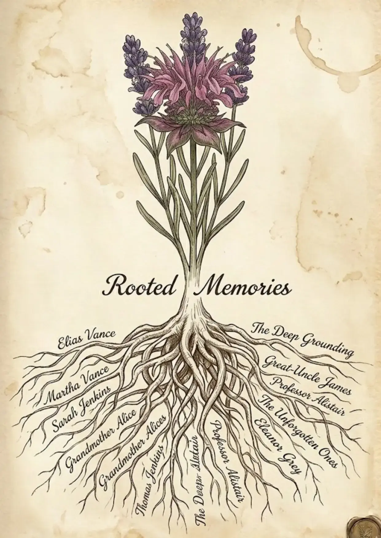 Junk journaling is often used for heritage and family history. Page 14 provides a stunning graphic of a plant where the roots are labeled with names like “Grandmother Alice” and “Elias Vance.”
