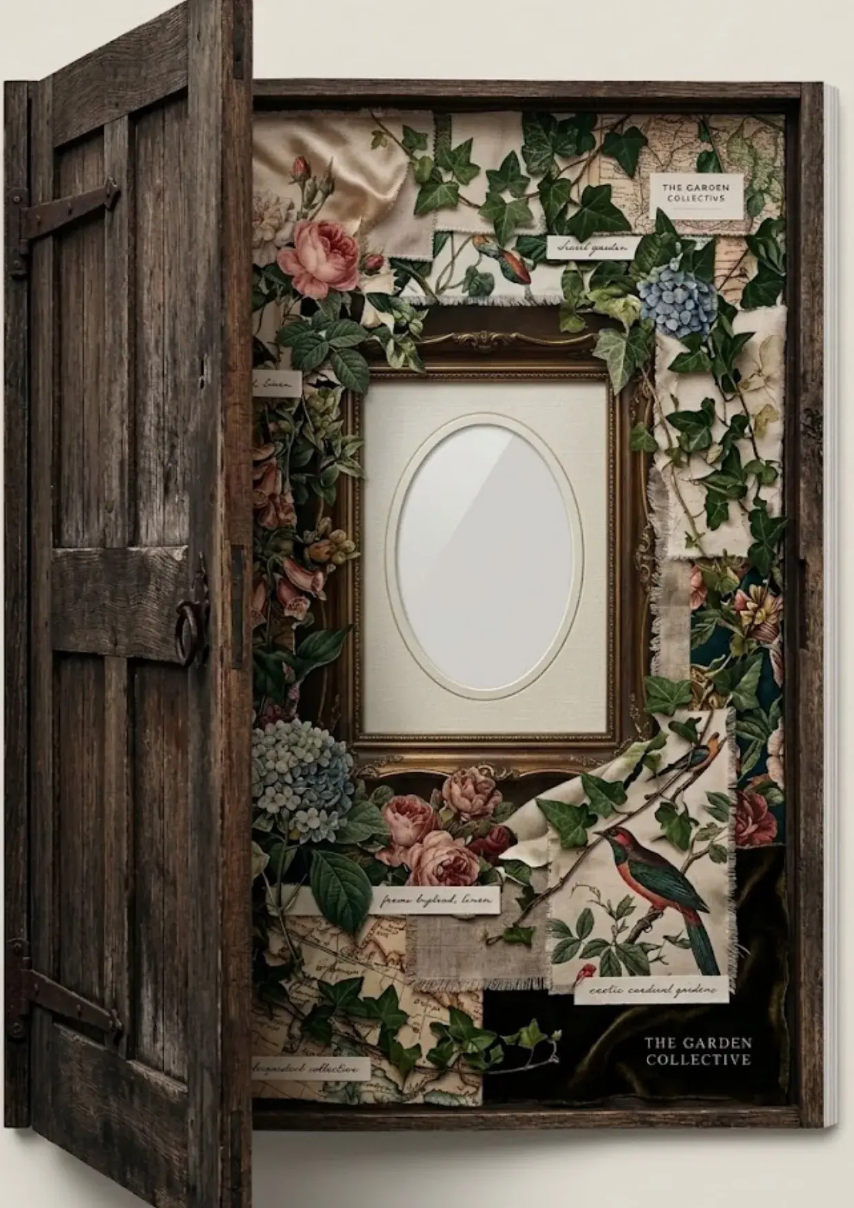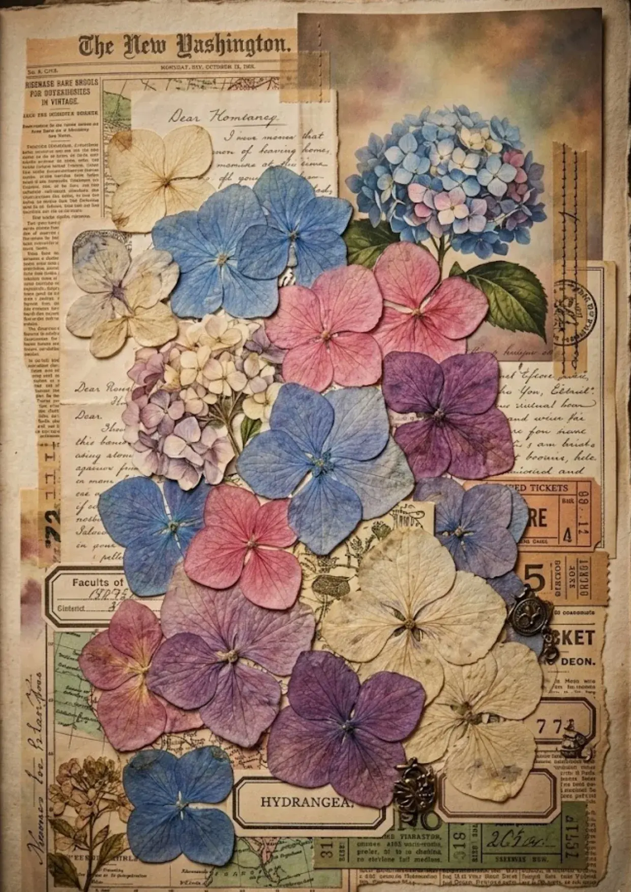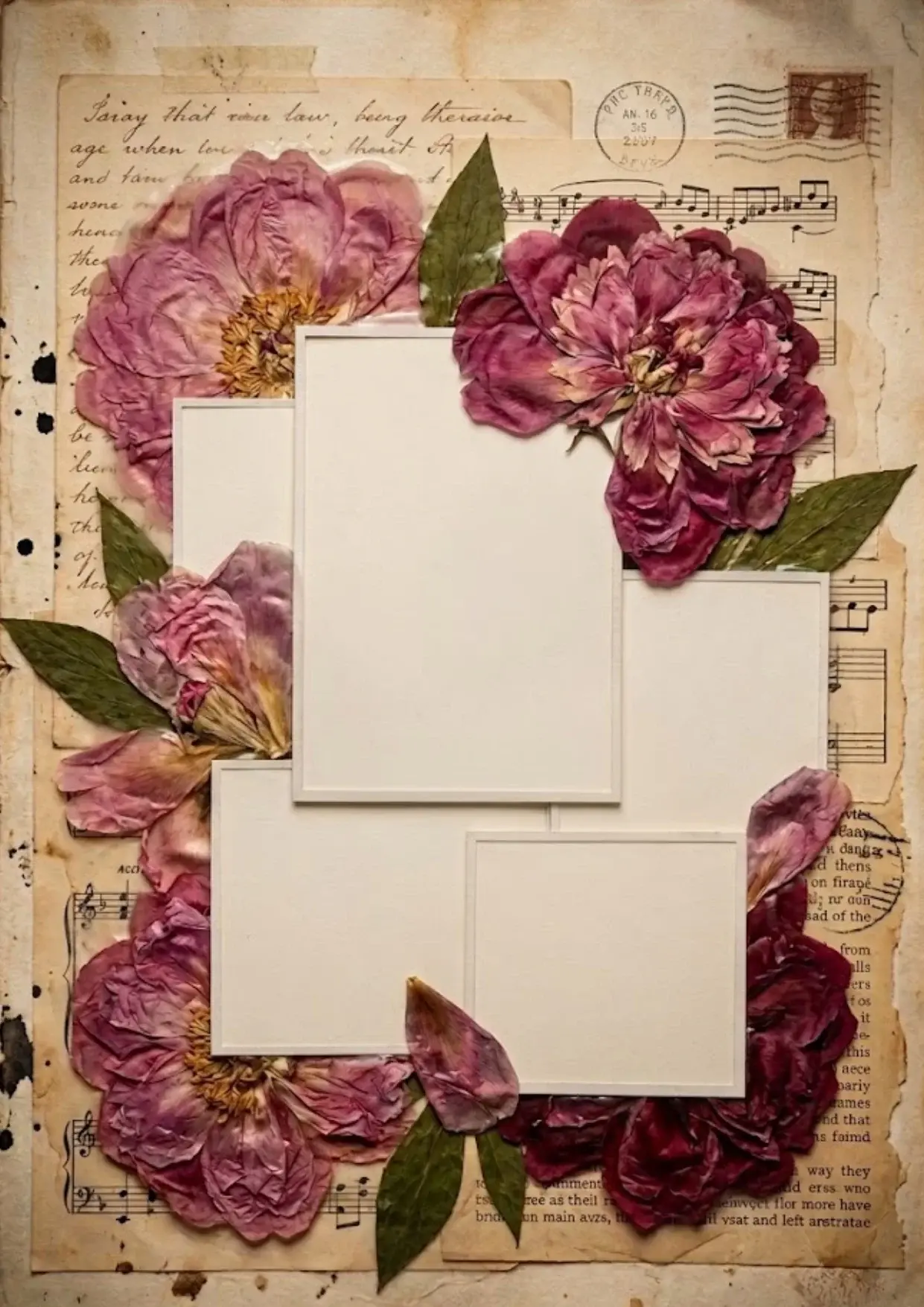 Complex Collages (Pages 21, 22): These are “ready made” art pages. Page 21 features hydrangeas layered over newspaper clippings (“The New Washington”), tickets, and bronze charms. Page 20 offers four empty white frames bordered by deep magenta peonies and antique music sheets.