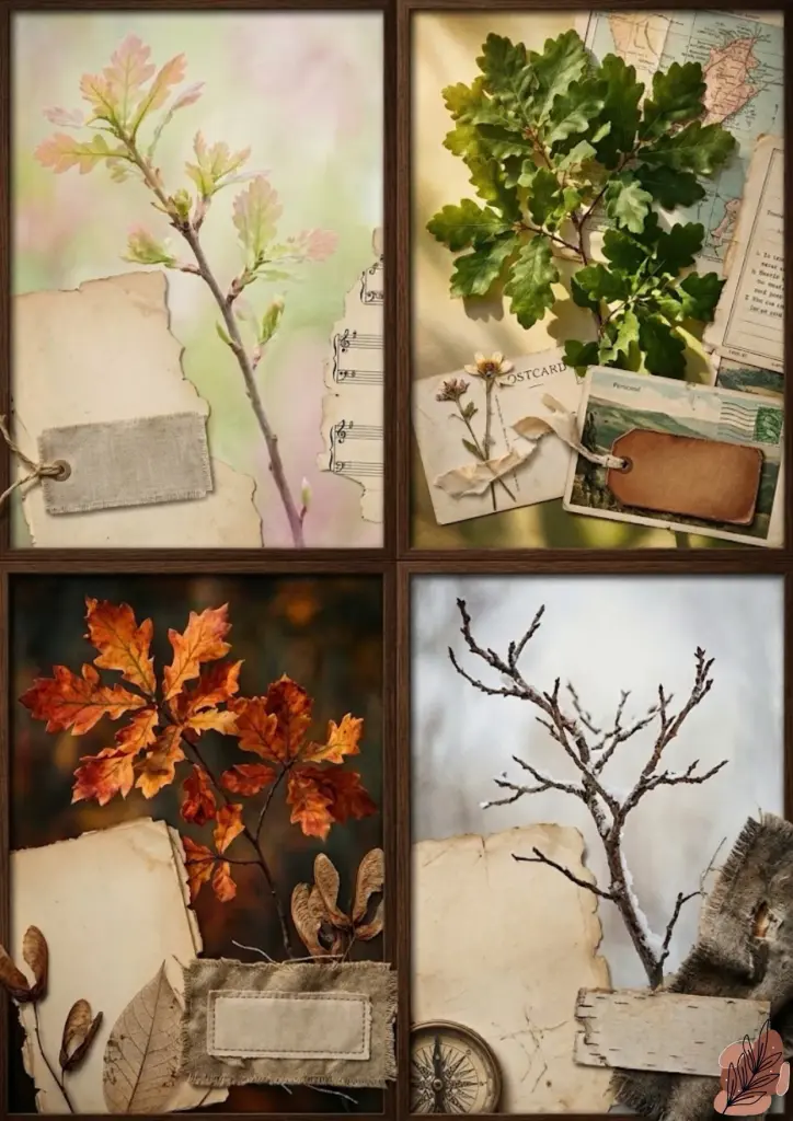 Symbolic & Structural (Pages 14, 15, 16): Page 14, titled “Rooted Memories,” uses a botanical root system to create a unique genealogy or memory map. Page 16 offers a four-pane window view of the seasons (Spring buds to Winter branches).