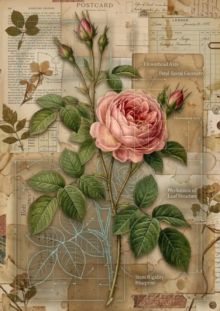 This is arguably the most unique page in the collection. It bridges the gap between art and science. By featuring a rose alongside architectural-style measurements and “stem rigidity blueprints,” it creates a sophisticated look that appeals to the “Dark Academia” aesthetic.