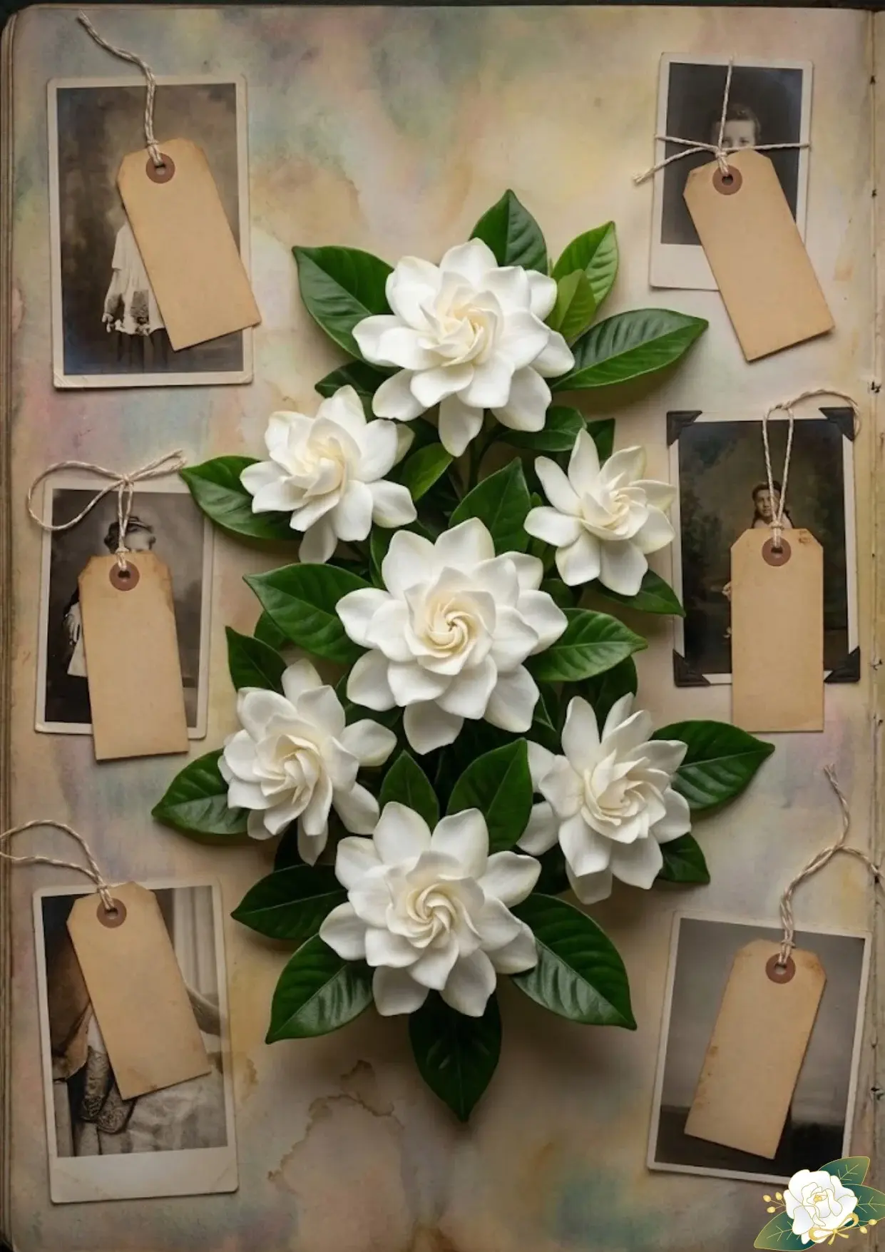 Romantic Nostalgia (Pages 3, 5, 6, 12, 17, 20): These use softer imagery like sweet peas, gardenias, and camellias set against textures of burlap, aged envelopes, and wax seals. Page 6 features a stunning open envelope design that looks three dimensional.