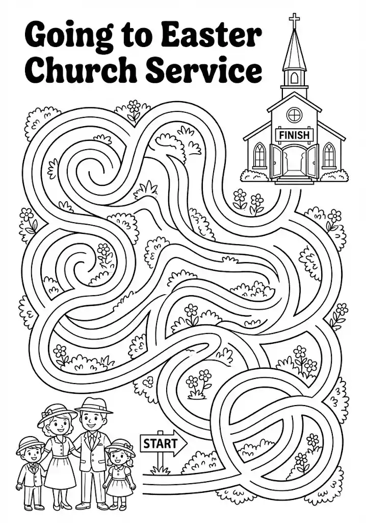 The Challenge: Help the family find their way to the Easter church service! A winding path leads a family dressed in their Sunday best to a beautiful church on the hill.