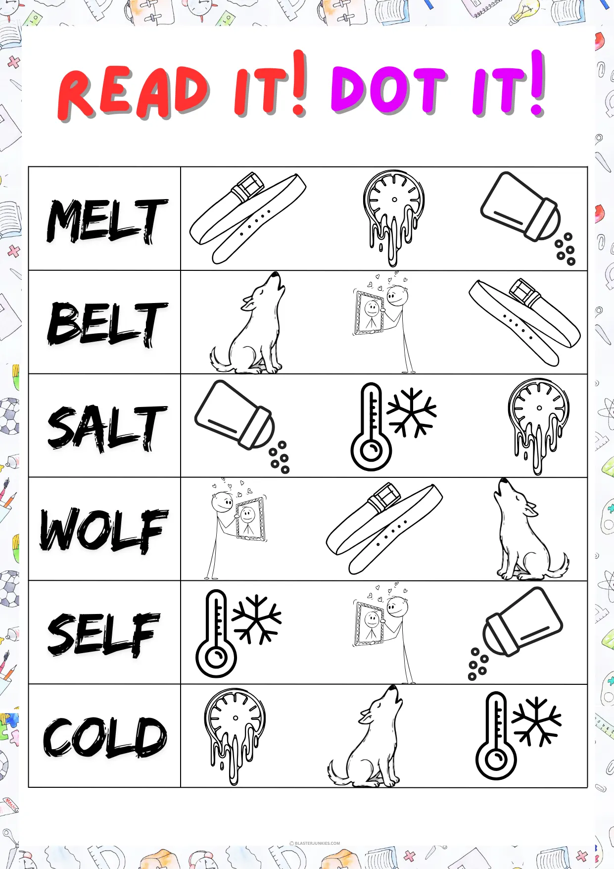 Words: Melt, Belt, Salt, Wolf, Self, Cold.