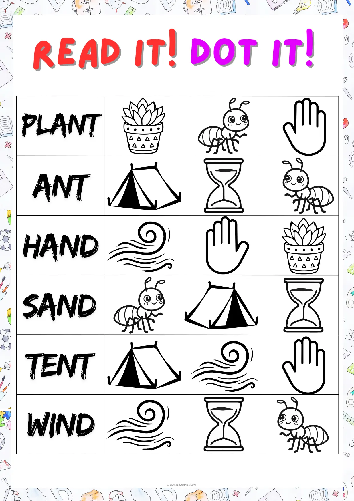 Each activity page follows the “Read It! Dot It!” format. There is a target word on the left, followed by three small illustrations. One illustration correctly matches the word, while the other two are “distractors” to ensure the child is truly reading and comprehending.