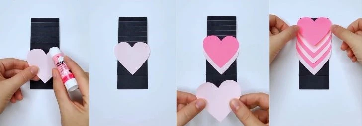 Finish the Stack: Continue layering until you have a stack of hearts on your pull strip. The largest heart should be at the top of the stack.