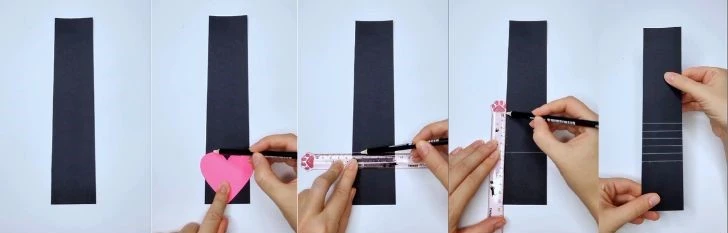 These marks indicate where each heart will be attached, creating the staggered, cascade effect when pulled. In the image, you scored four lines about 1 cm apart.