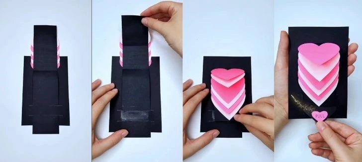 Final Test: Push the tab up until the hearts are hidden and the “PULL” tab is visible. Give it a gentle tug! As the message slides down, the hearts should beautifully cascade open, revealing the entire stack and the message.