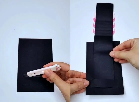 Cut the Base Strip: Take a strip of black cardstock, which will serve as the pull out message and the mechanism. The strip should be long and thin.