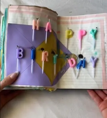 Place the Candles: Arrange the “Happy Birthday” candles across your spread. Gently push the sharp ends into the paper to hold them in place. Some can go into the envelope for stability.