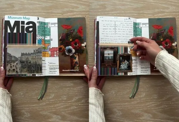 Feature Your Favorites: Use postcards of key artworks as large visual elements. For other pieces you loved, print out small photos and arrange them around the page.