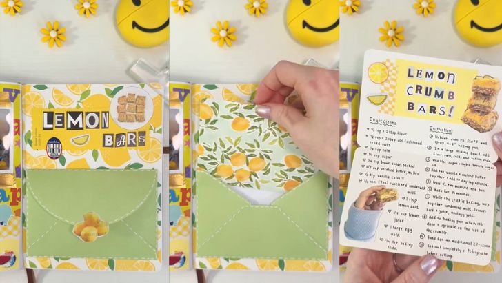 Set the Theme: Cover your journal page with a patterned paper that matches your recipe like a lemon print for lemon bars!