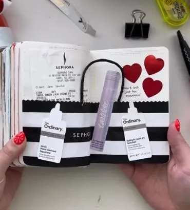 Press and Trim: Smooth the receipt onto the page, pushing out any air bubbles. If any part of the receipt hangs over the edge, you can either fold it over or neatly trim it with scissors for a clean edge. Now you have a unique background ready for photos, stickers, or journaling.