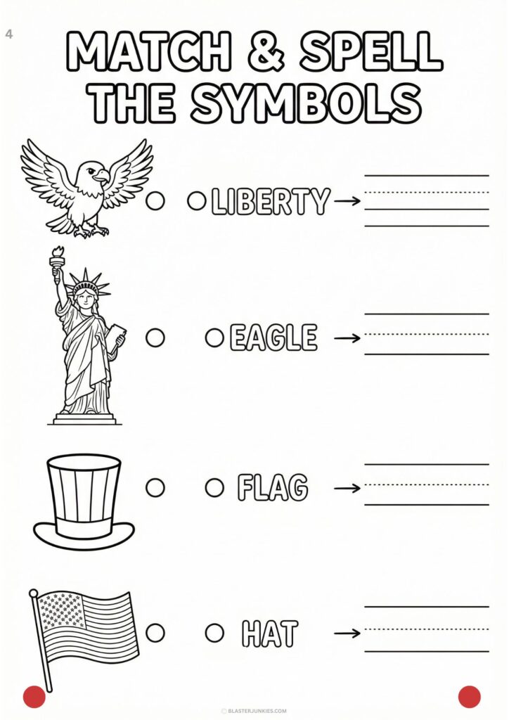 What it is: A handwriting and connection activity. On the left, there are icons (Eagle, Statue of Liberty, Hat, Flag). On the right, students must find the matching word and then practice writing it neatly on the dotted lines.