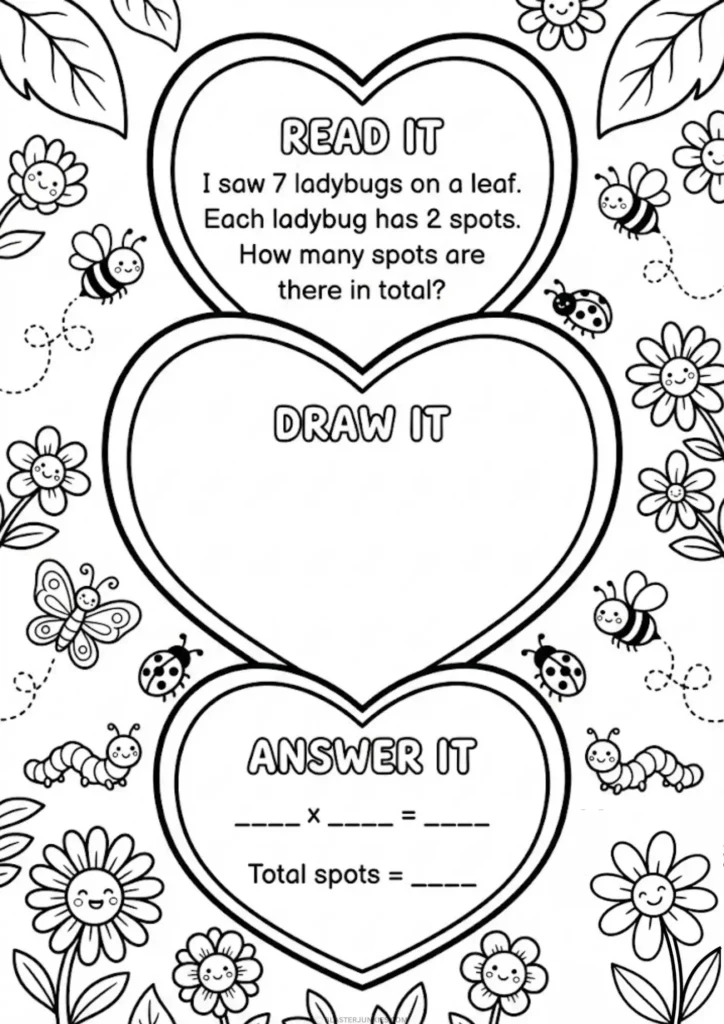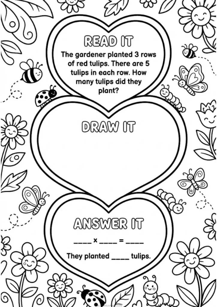 This set of 8 Free Printable A4 Worksheets uses a unique “Read It, Draw It, Answer It” framework. This visual method is a game changer for second graders, helping them transition from simple addition to understanding the concept of multiplication (groups of numbers).